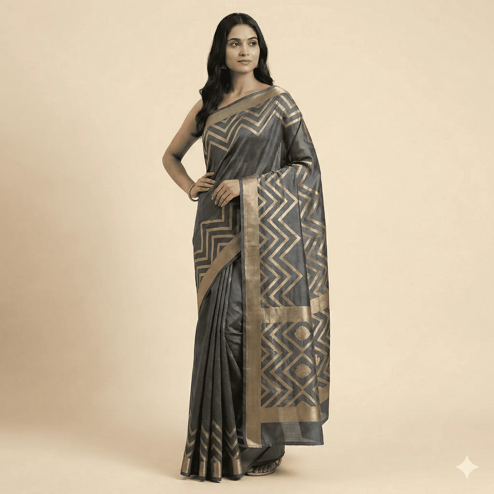 Introducing our Charcoal Grey Geometric Silk Saree that seamlessly blends traditional elegance with contemporary design. Its intricate geometric patterns and luxurious silk fabric offer grace and versatility, perfect for festive celebrations or formal gatherings.